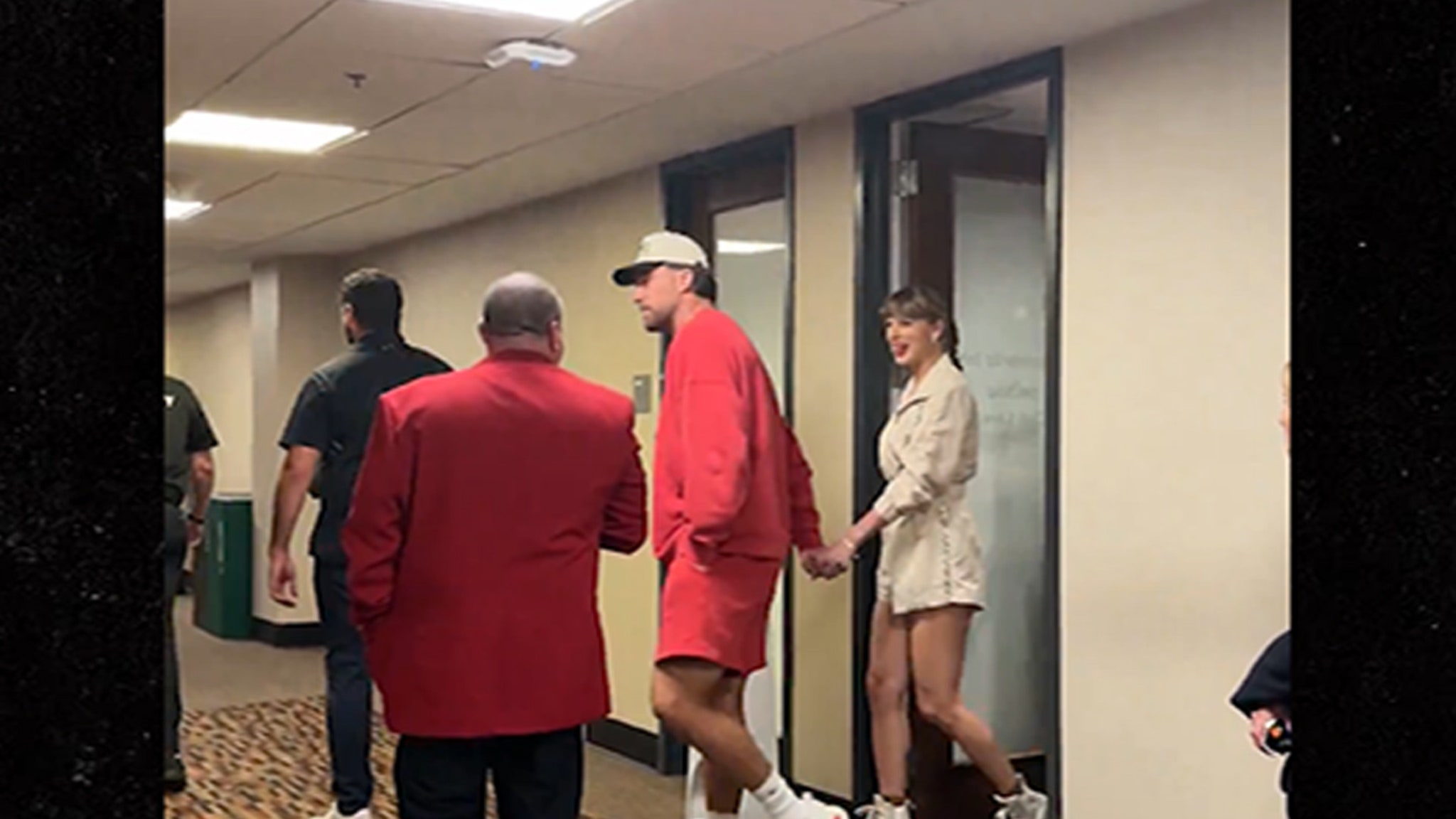 Video is circulating online of the pair walking the halls together … with Travis decked out in red, and Taylor looking angelic in a cream-colored outfit.